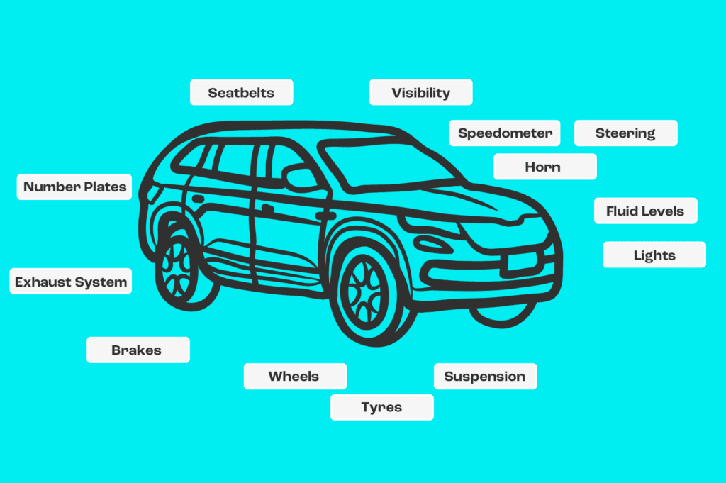 - Visibility: Checking the condition of wipers, mirrors, and windscreen to make sure you have a clear view of the road.